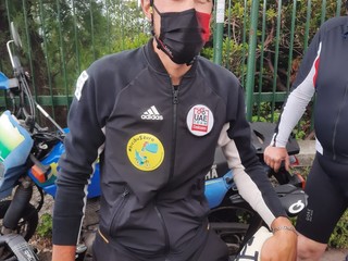 Trentin ha portato con sé i cartelli di salvaguardia delle persone che vanno in bicicletta promossi dall’associazione “Io rispetto il ciclista” e dalla Fondazione Michele Scarponi, intitolata al corridore marchigiano deceduto il il 22 aprile 2017 dopo essere stato investito in strada.