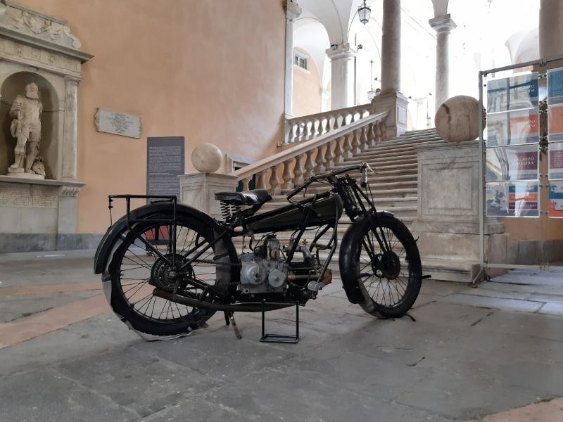 La Guzzi G.P. 500, sogno di ogni motociclista, è arrivata a Genova accolta come una star e resterà esposta in una teca nell’atrio del Municipio sino al 16 maggio in occasione dei Rolli Days Live & Digital: è la prima volta da circa un secolo che questa moto torna in città dopo esserci stata per un giro di prova a Carignano guidata da Giorgio Parodi col padre Emanuele Vittorio come passeggero sul portapacchi.