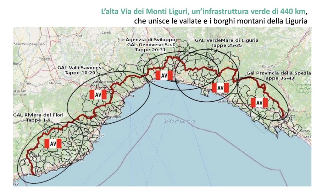 In Liguria esiste un sentiero di crinale che attraversa tutta la regione, dall’estremo ponente all’estremo levante. Che è pieno di fascino e di attrattività e che va sempre più promosso e rilanciato, a livello turistico ed escursionistico. Ma tutto questo non basta, se l’Alta Via dei Monti Liguri non viene messa in relazione con tutta la fitta rete di collegamenti sottostanti e con tutta la fitta presenza di borghi e di paesi dell’entroterra: solo e soltanto così, con un recupero e una valorizzazione completi, l’Alta Via può fungere da traino, ed è proprio in questa direzione che va il progetto ‘AV 2020 - L’Alta Via dei Monti Liguri da sentiero di crinale a rete di persone’, un ambizioso percorso di cooperazione che vede coinvolti i cinque Gal della nostra regione, vale a dire i cinque gruppi di autonomia locale.