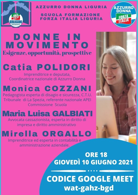 Proseguono gli incontri della Scuola di Formazione di Forza Italia in Liguria, con una videocall dedicata al tema “Donne in movimento. Esigenze, opportunità, prospettive”. La riunione, che avrà luogo quest’oggi alle ore 18.00 sulla piattaforma Google Meet, è promossa dal Settore Formazione regionale di Forza Italia in collaborazione con Azzurro Donna Liguria, il Movimento femminile del partito.