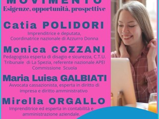 Interverranno l’on. Catia Polidori, imprenditrice e deputata, coordinatrice nazionale di Azzurro Donna; Monica Cozzani, pedagogista esperta di disagio e sicurezza, CTU Tribunale della Spezia, referente nazionale APEI Commissione Scuola; Maria Luisa Galbiati, avvocata cassazionista, esperta in diritto di impresa e diritto amministrativo; Mirella Orgallo, imprenditrice ed esperta in contabilità e amministrazione aziendale.