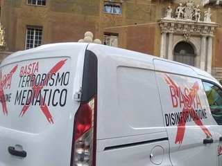 Poche, anzi praticamente nessuna mascherina tra i presenti. Curiosità: parcheggiato sulla strada c'era anche il furgoncino di nobufale.it, un sito frequentato da negazionisti del covid