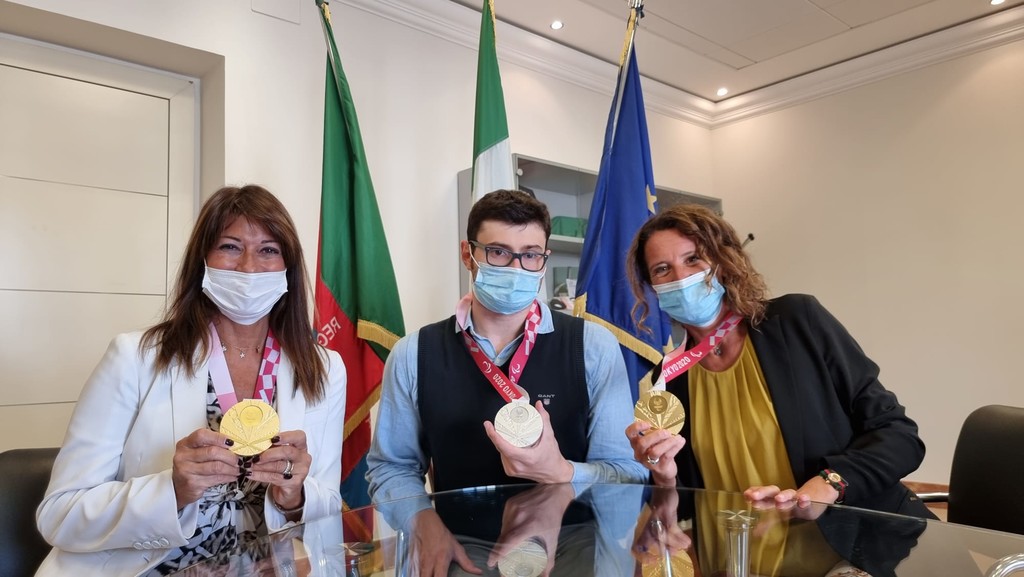 Con le sue tre medaglie, due ori e un argento, ottenute alle Paralimpiadi di Tokyo in Giappone, il campione paralimpico genovese di nuoto Francesco Bocciardo quest’oggi si è recato in visita negli uffici di Regione Liguria.