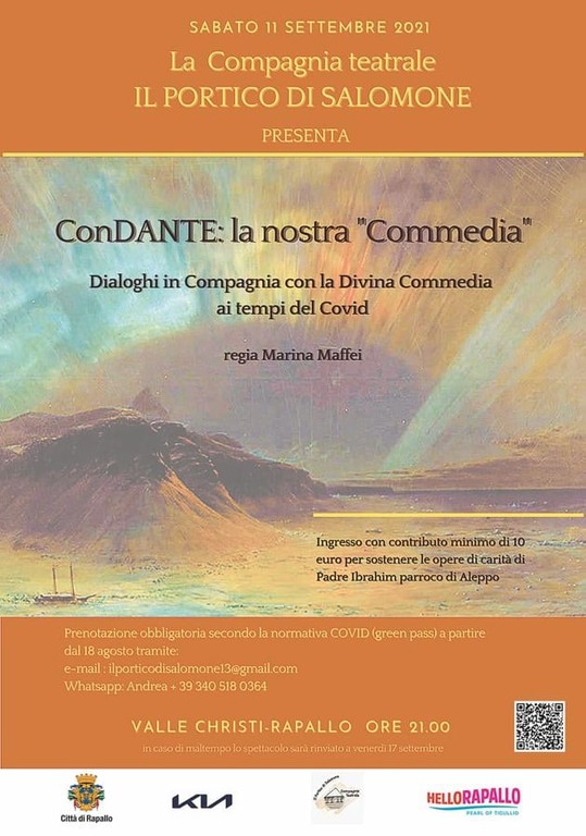 Nasce così il nuovo spettacolo proposto dalla compagnia diretta da Marina Maffei, nata a Rapallo nel 2012 e già protagonista di diverse interpretazioni di successo. Il titolo è “ConDANTE - La nostra Commedia”: una serie di letture e dialoghi che i giovani attori porteranno in scena sabato 11 settembre, alle ore 21, nella suggestiva cornice del monastero di Valle Christi. L’evento è stato presentato stamane, nella sala consiliare del municipio di Rapallo.