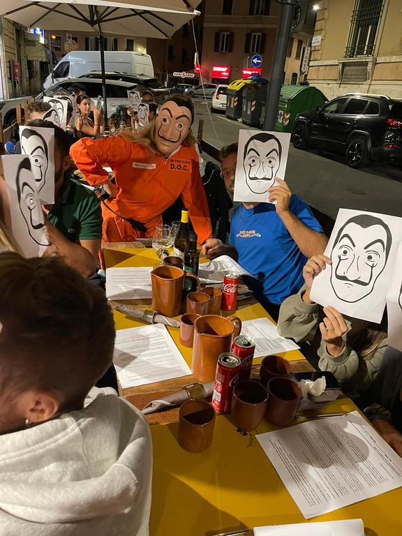 Più di cinquanta ostaggi in un ristorante di Genova, i rapinatori hanno la maschera di Dalì: niente paura, è la cena con delitto ispirata alla casa di carta.