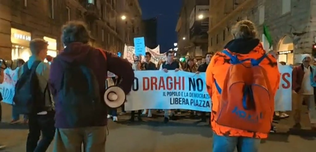 "Vaccipicchia", la manifestazione contro la certificazione verde, è proseguito con un corteo: in testa striscioni contro Draghi e Toti