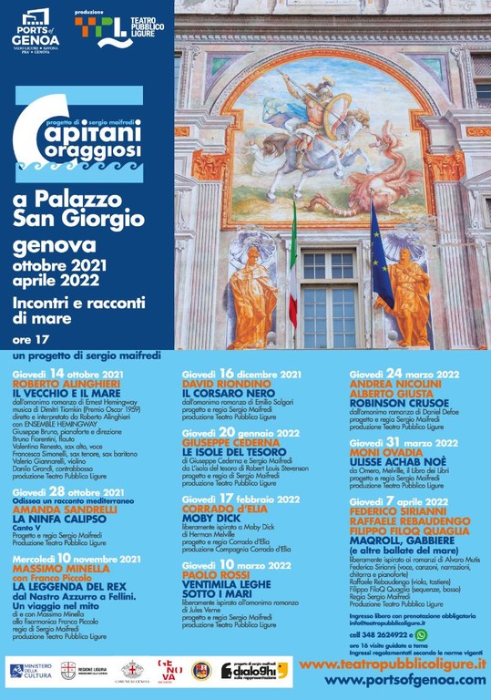 Comincia con un concerto ‘Capitani coraggiosi a Palazzo San Giorgio’, nuovo progetto di Teatro Pubblico Ligure ideato a e diretto da Sergio Maifredi col sostegno dell’Autorità di sistema portuale del Mar Ligure Occidentale e il patrocinio dell’Accademia italiana della marina mercantile.