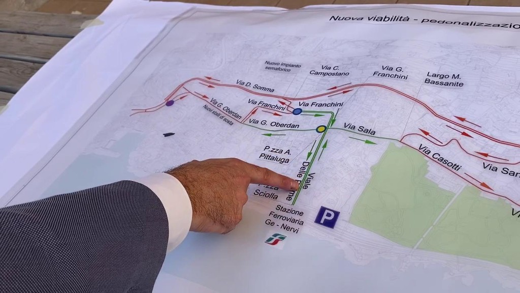 La nuova viabilità prevede un solo senso di marcia. Nel primo tratto di via Oberdan è prevista una sola corsia verso largo E. Pesce fino all’incrocio con viale Franchini (50 posti auto e merci); si svolta a sinistra per l’Aurelia, al semaforo di Campostano salendo e l’ufficio postale scendendo. Si inverte il senso unico in via Campostano, in direzione monte con nuovo impianto semaforico all’incrocio con via D. Somma, per tornare in centro; obbligo di svolta a destra in via Sala per i veicoli provenienti dalla stazione. Chi ha il pass torna a ponente, gli altri saranno indirizzati al parcheggio della stazione o via Marco Sala. Sul fronte trasporti restano le linee Amt 516 e 517, ma nascerà la nuova linea 515, che da largo Pesce attraversa via Oberdan, viale Franchini, piazza Pittaluga, via Sala, largo Bassanite, via Sant’Ilario e via D. Somma con capolinea davanti alla P. A. Nerviese: 15 le banchine e nuovo il capolinea per il 15 in via Pagano, insieme al 17.