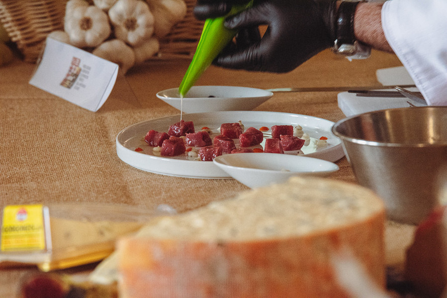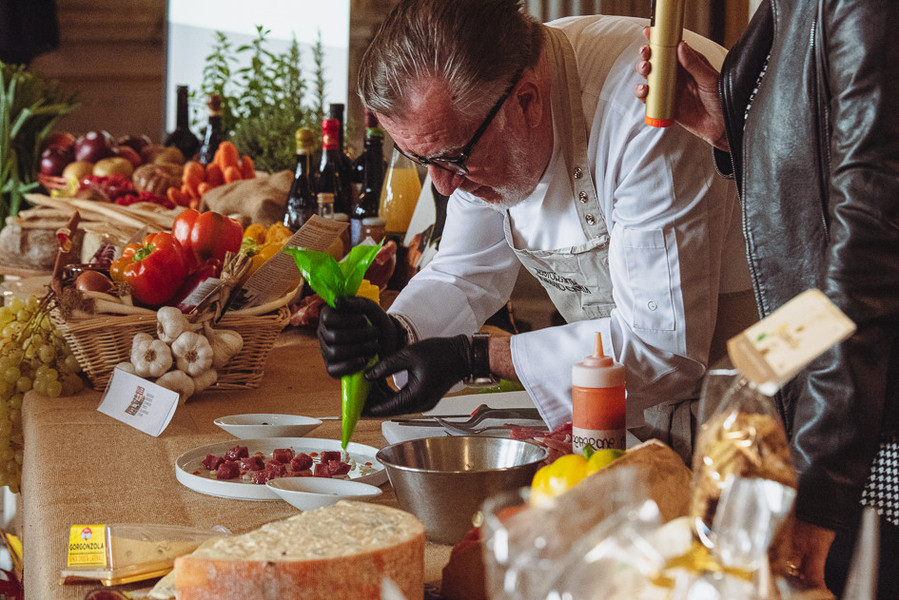 La preparazione del piatto, “Cubo di sottofiletto di Fassone con Peperone rosso di Cuneo, fonduta di Gorgonzola, crema di Aglio di Caraglio e scaglie di Grana”, è avvenuta nella sala di Ercole, mentre lo chef Camia illustrava i passaggi per la preparazione del piatto, la sua squadra, coordinata dalla figlia Elisabetta, sous chef, ha distribuito graditi assaggi al pubblico.