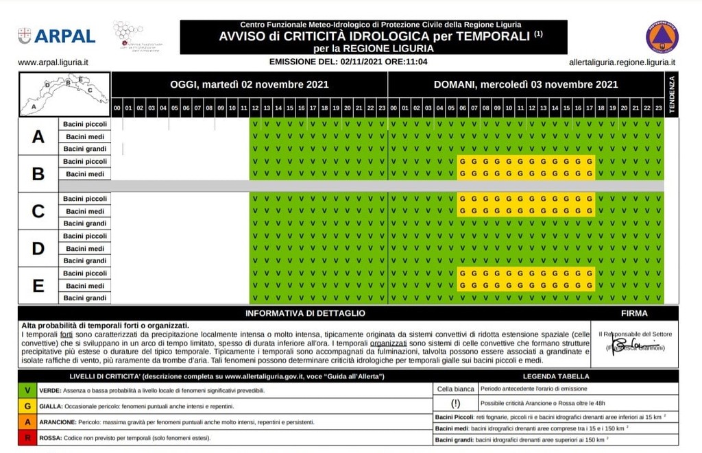 Domani, mercoledì 3 novembre, dalle ore 6 alle 18, nuova allerta meteo gialla per temporali sul centro levante (zone B, C, E). Coinvolti i bacini piccoli e medi.