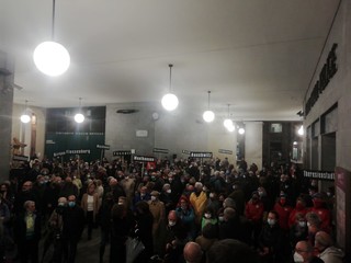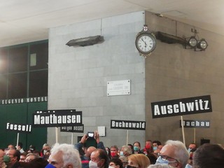 Davanti ai gonfaloni della Regione e del Comune e di fronte alla folla su cui ondeggiano i cartelli coi lugubri nomi di Auschwitz, Treblinka, Mathausen, Fossoli (anche in Italia ci sono stati campi di concentramento e sterminio), canta il coro Shlomot e poi riecheggia il monito contro il fascismo e il razzismo sempre pronti a riemergere. Nelle parole di Dello Strologo “non può esserci presente senza memoria”.