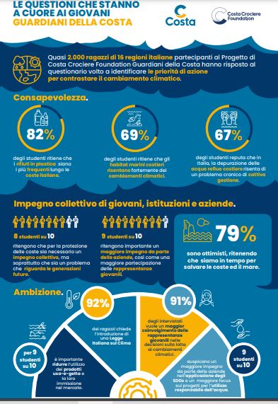“La sostenibilità è parte integrante del modello di business di Costa Crociere. Abbiamo introdotto per primi tecnologie di propulsione più sostenibili, come il gas naturale liquefatto, e stiamo lavorando a ulteriori soluzioni che ci consentiranno di avvicinarci nei prossimi anni all’ambizioso obiettivo della prima nave a zero emissioni nette. Abbiamo avviato progetti all’avanguardia di economia circolare e uso responsabile delle risorse, mettendo le persone al centro della nostra strategia, anche attraverso l’azione della nostra Fondazione” ha aggiunto Davide Triacca, Sustainability Director di Costa Crociere e Segretario Generale della Fondazione. “Con il progetto Guardiani della Costa siamo orgogliosi di poter contribuire alla formazione dei giovani che diventeranno così cittadini ancora più consapevoli e sensibili. In piena convergenza con l’operato dei Ministeri dell’Istruzione e della Transizione Ecologica, e in linea con le istanze avanzate dai ragazzi, continueremo a lavorare per portare tra i banchi di scuola l'educazione allo sviluppo sostenibile ed espandere ulteriormente i nostri progetti attuali nelle direzioni indicate dai giovani”.