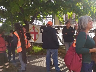 Lavoratori Hitachi in presidio questa mattina davanti la sede dell’azienda, a Sampierdarena, contro green pass e l’obbligo di rientrare a lavoro in presenza per due giorni a settimana