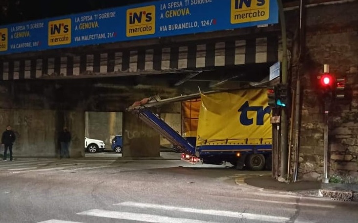 Tir incastrato sotto un tunnel in via Degola, disagi per il traffico