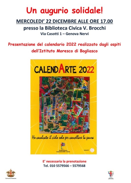 ‘Un augurio solidale’: è il nome dell’evento patrocinato dal comune di Genova e dal Municipio Levante in occasione della presentazione a cittadini ed autorità del calendario 2022, ‘Calendarte’, nato sulle ali della fantasia e realizzato dagli ospiti dell’Istituto Moresco di Bogliasco; la festa avrà luogo il 22 dicembre, all’interno della civica biblioteca V. Brocchi, in via Casotti 1, a Nervi.