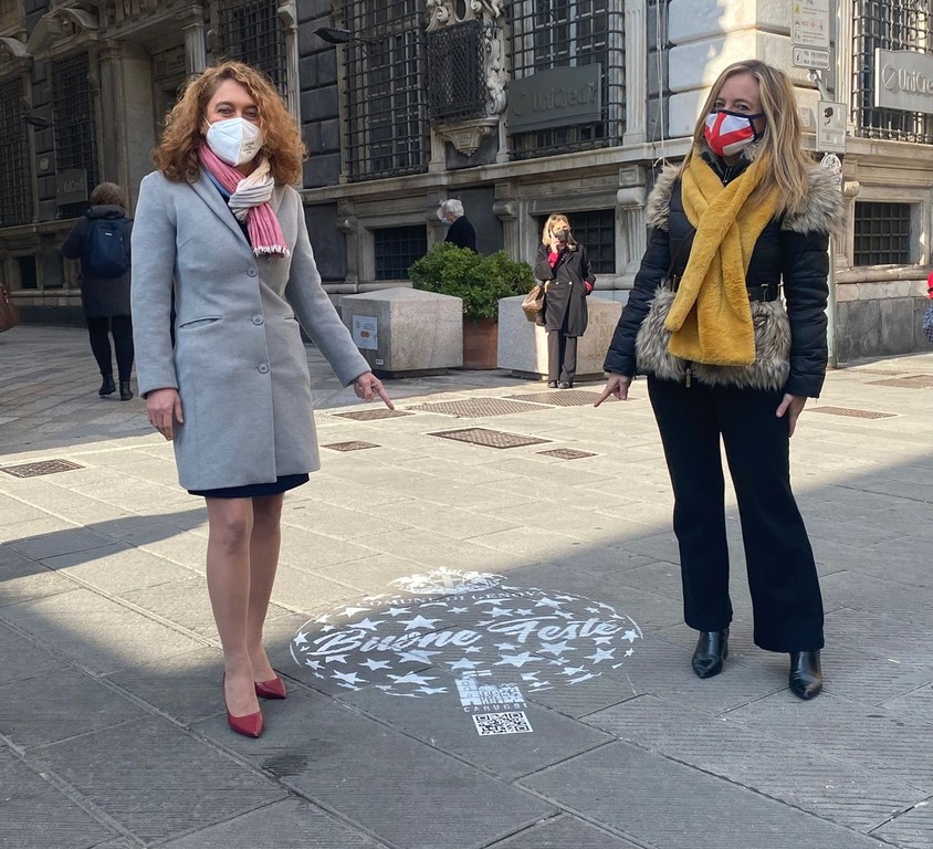 Gli stencil riportano anche il logo Caruggi e permetteranno ai turisti di scoprire Genova grazie al collegamento diretto con il sito Visitgenova.it