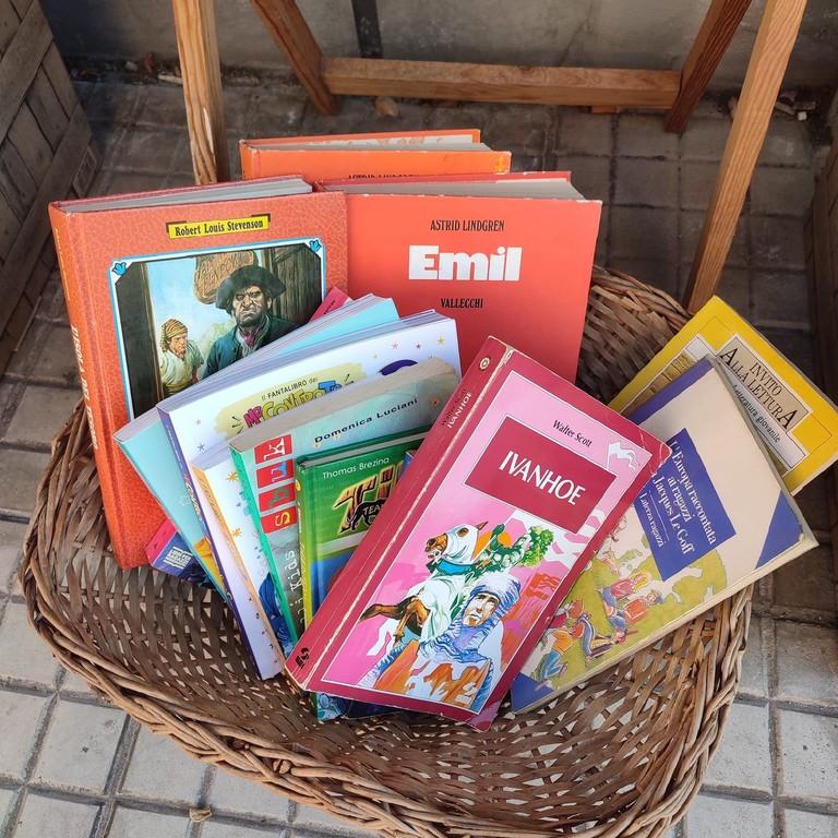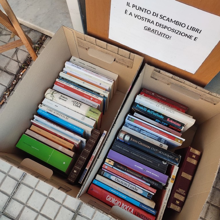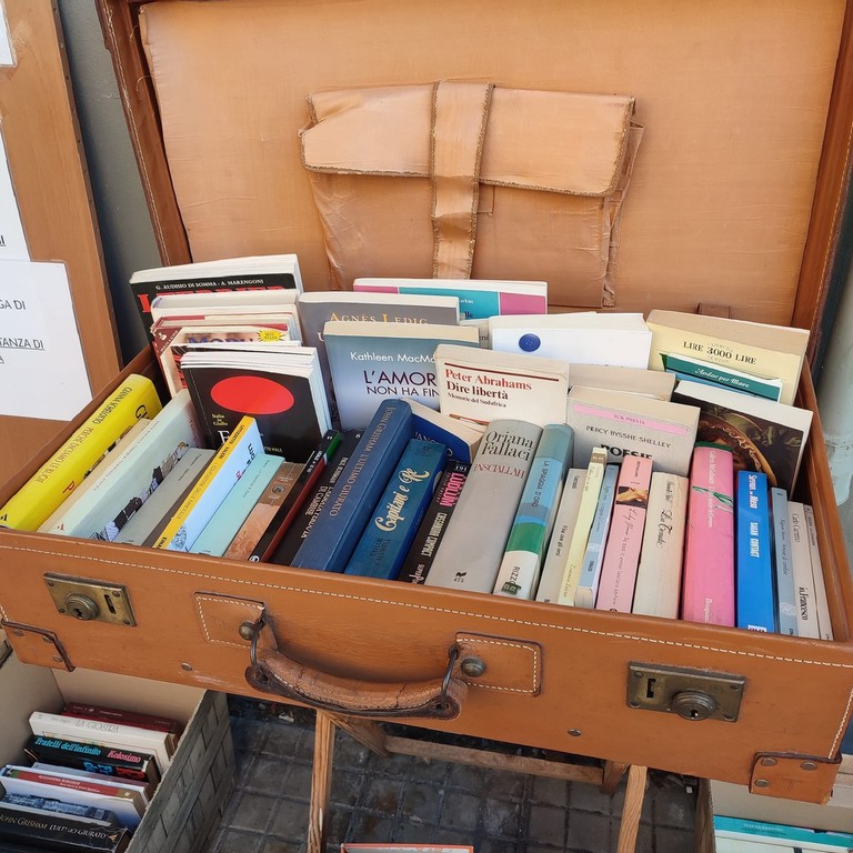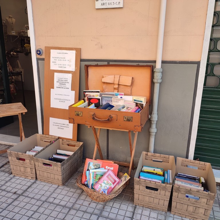 Una valigia e diverse cassette di legno raccolgono libri messi a disposizione: si possono scambiare, prendere, portare, tutto in maniera completamente gratuita.