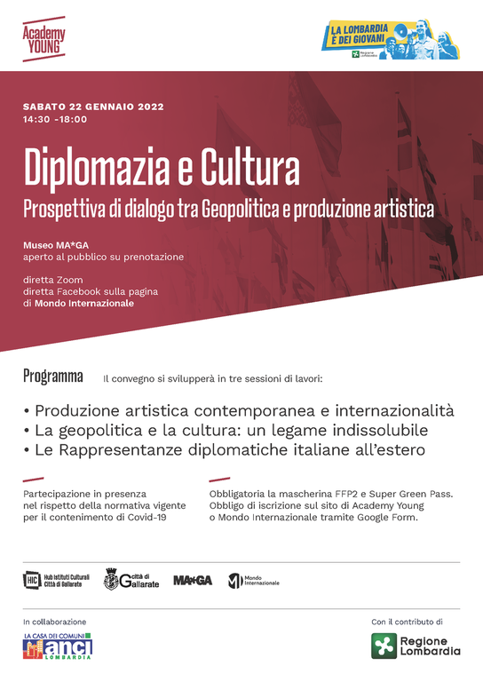 L’inizio del nuovo anno celebra il completamento del progetto Academy Young avviato nell’ottobre del 2019 con il contributo di Regione Lombardia in collaborazione con ANCI, che vede la partecipazione di numerosi partner della provincia di Varese, tra cui il Comune di Gallarate in qualità di capofila, Mondo Internazionale e il Museo MA*GA tra i partner principali. In questo contesto, nell’ambito del progetto dedicato alla formazione e professionalizzazione dei giovani, Mondo Internazionale propone il convegno di “Diplomazia e Cultura. Prospettiva di dialogo tra Geopolitica e produzione artistica”. Il convegno si svilupperà in tre sessioni di lavori e si terrà il 22 gennaio 2022 presso il Museo MA*GA a Gallarate nella Sala degli Arazzi Ottavio Missoni dalle ore 14.30 alle ore 18.00.