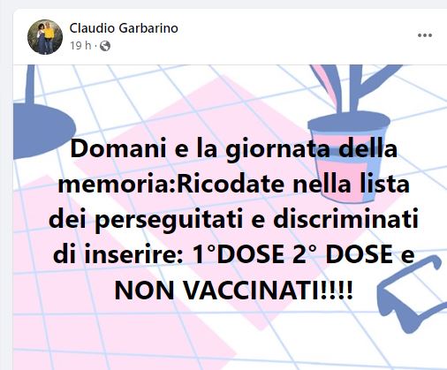 “Domani è la giornata della memoria: Ricodate (sic!) nella lista dei perseguitati e discriminati di inserire: 1° dose 2° dose e non vaccinati!!!” A produrre il post, pubblicato su Facebook è stato Claudio Garbarino, leghista, consigliere metropolitano con deleghe ai trasporti e al piano strategico, in passato con delega alle pari opportunità.