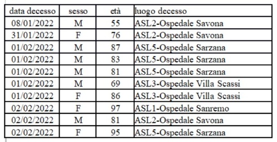 Da segnalare, inoltre, 10 decessi dall'8 gennaio (in questo caso ha riguardato un 55enne deceduto all'ospedale di Savona) al 2 febbraio. Prosegue il calo dei ricoverati (-10) e degli attualmente positivi (-1.716).