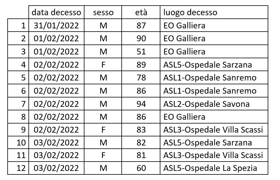 In data odierna sono 12 i decessi comunicati, avvenuti tra il 31 gennaio e il 3 febbraio