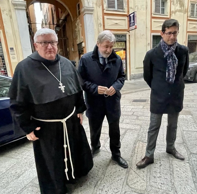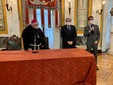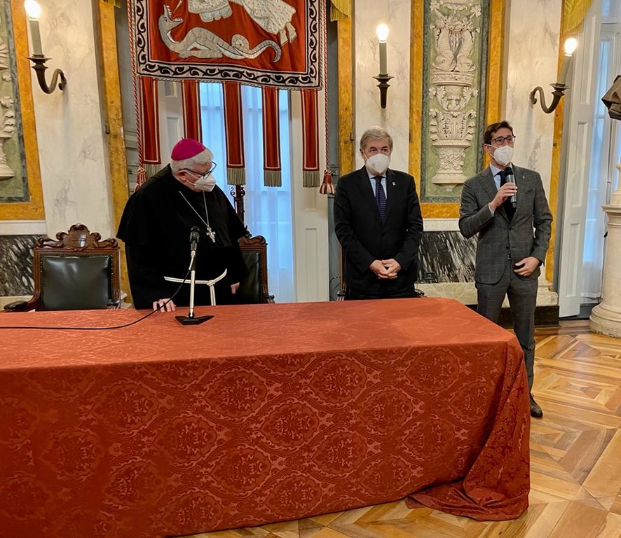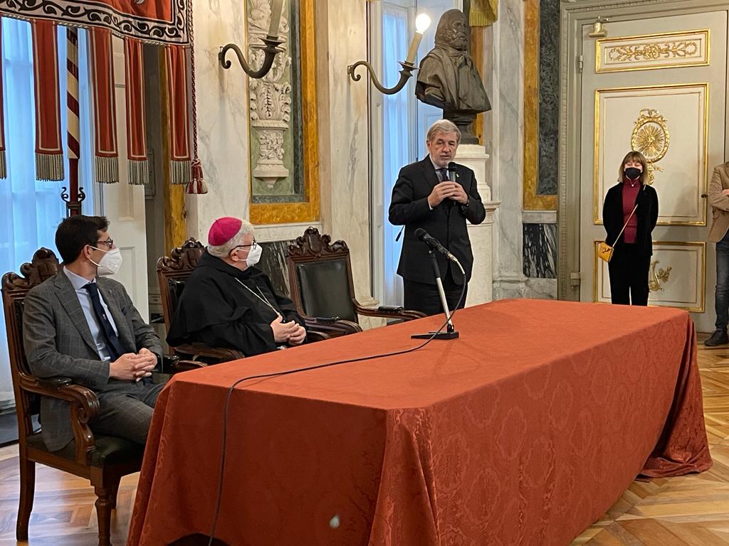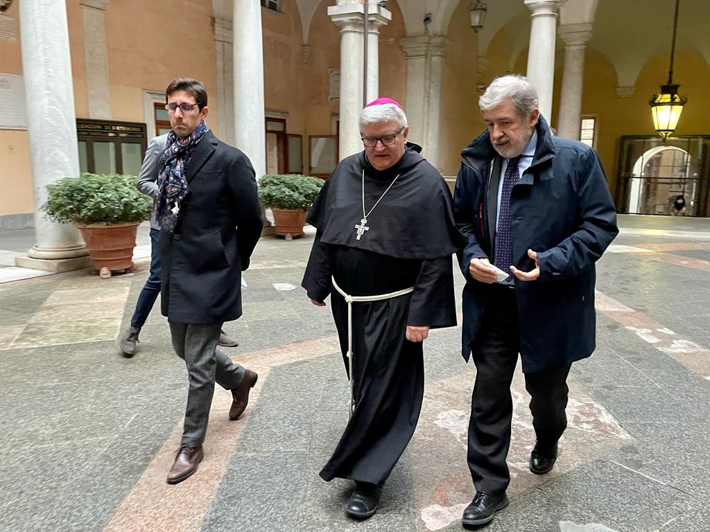 L’arcivescovo è stato ricevuto dal sindaco Marco Bucci e dal presidente del Consiglio comunale Federico Bertorello in un appuntamento che, come ogni anno, ricambia la visita del sindaco in Curia nei giorni che precedono il Natale.