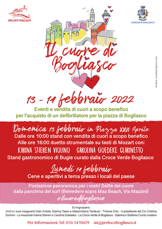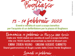 Domenica 13 in piazza XXVI Aprile dalle ore 10 si potranno trovare i "cuori di Bogliasco", produzioni in tessuto fatti a mano dai volontari grazie al supporto del Civ, dei negozianti e degli artigiani locali, ma anche di privati cittadini. Il ricavato della loro vendita servirà per l'acquisto di un defibrillatore per la piazza del paese.