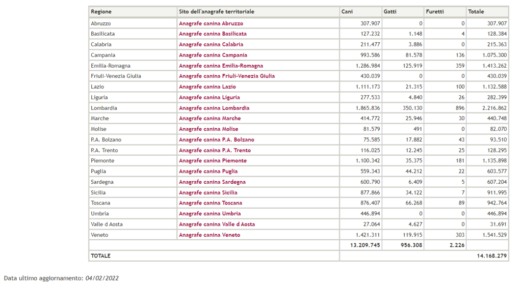 I numeri sono estratti dalla banca dati dell'Anagrafe degli animali d'affezione gestita dal Ministero della Salute, che viene alimentata e aggiornata almeno una volta al mese dalle Regioni e dalle Province autonome.