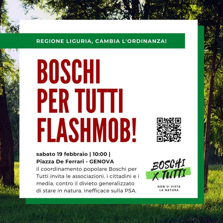 Flash mob ‘Boschi per tutti’ davanti alla sede di Regione Liguria. Chiedere un tavolo con il presidente e gli assessorati competenti. È questo l’obiettivo dei promotori della manifestazione, (ne avevamo scritto nei giorni scorsi) al fine di ottenere le opportune deroghe all’ordinanza ritenuta profondamente ingiusta di frequentare i boschi a causa della ‘peste suina’.