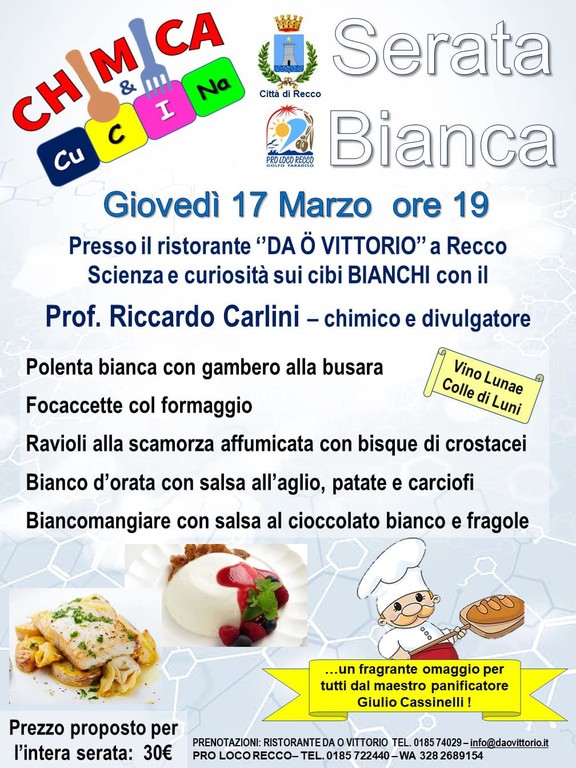 Argomento del prossimo incontro sarà la Serata Bianca in compagnia del Prof. Riccardo Carlini, chimico, ricercatore e divulgatore scientifico che presenterà tutti i segreti dei cibi bianchi.