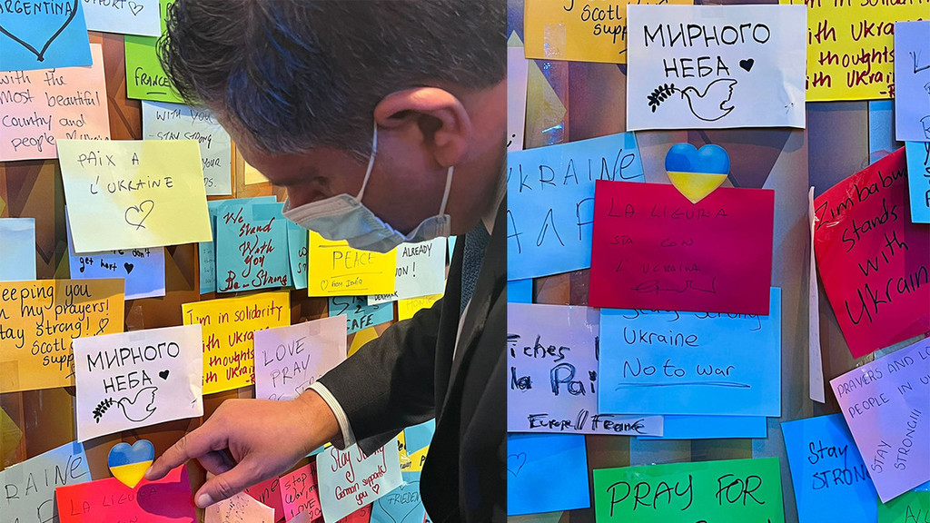 "La Liguria sta con l'Ucraina", poche parole scritte su un foglietto rosso che il Governatore ha lasciato all'interno del padiglione ucraino, unendosi a centinaia di altri messaggi di vicinanza alla popolazione.