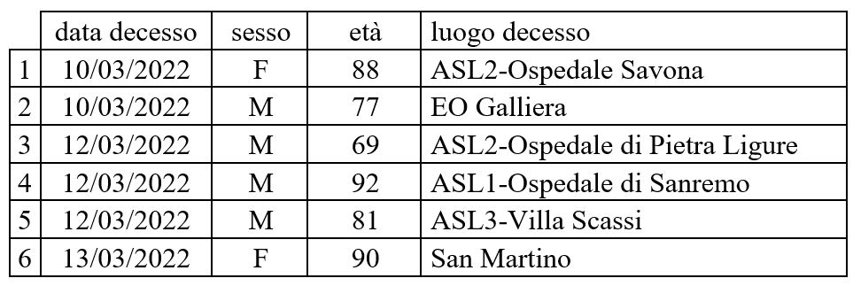 Diminuiscono i ricoverati mentre sono 6 i decessi comunicati in data odierna, avvenuti tra il 10 e il 13 marzo