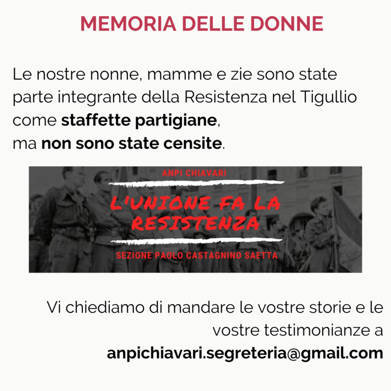 Chiunque avesse notizie, documenti e una storia da raccontare è invitato a scrivere il tutto all’indirizzo anpichiavari.segreteria@gmail.com inserendo anche un recapito telefonico.