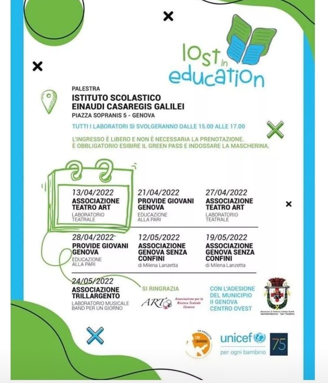 Tra le altre iniziative in programma quella dell’Associazione Genova senza Confini, prevista per il 12 maggio e che replicherà il 19. Negli spazi previsti per laboratori teatrali, da citare quella che andrà in scena il 24 maggio a cura dell’associazione Trillargento, laboratorio musicale band per un giorno. Alle iniziative targate ‘Einaudi, Casaregis, Galilei’, aderisce il Municipio di Centro Ovest, mentre Unicef è particolarmente attenta a quanto riguarda gli spazi per i più giovani.