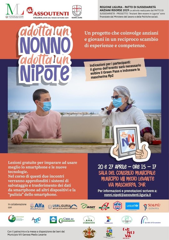 Le lezioni sono gratuite, a cura di Assoutenti Liguria, nell’ambito del Patto di sussidiarietà ‘Anziani Ben essere in Liguria’, finanziato dal Ministero del Lavoro e delle Politiche sociali. L’obiettivo del progetto è quello di promuovere e diffondere una rete di mutuo aiuto tra nipoti e nonni, all’interno del quale i nipoti possono aiutare i nonni rispetto all’uso delle varie tecnologie digitali e fornire una vera e propria assistenza digitale e viceversa. I nonni possono spiegare e insegnare ai più giovani i concetti cari all’economia circolare, come il riciclo e il riuso degli oggetti.