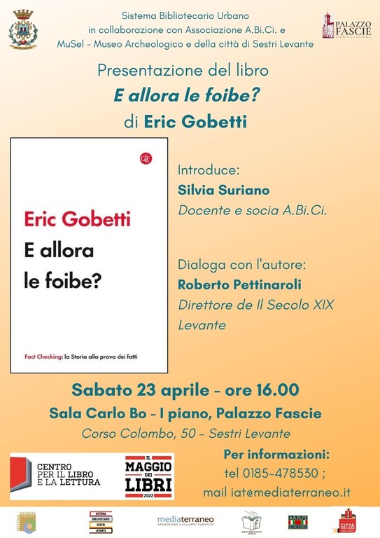 La presentazione è organizzata dal Comune di Sestri Levante e Mediaterraneo Servizi, tramite il Sistema Bibliotecario Urbano e il MuSel – il Museo Archeologico e della Città, in collaborazione con l’Associazione A.Bi.Ci e con il patrocinio della sezione ANPI di Sestri Levante. La partecipazione è gratuita e inaugura le iniziative de Il Maggio dei Libri, campagna nazionale a cura del Centro per il Libro e la Lettura che ha l’obiettivo di sottolineare il valore sociale dei libri quale elemento chiave della crescita personale, culturale e civile. Il tema per il 2022 è ContemporaneaMente. Leggere per comprendere il passato, il presente, il futuro. Tutte le iniziative sono disponibili sul sito https://www.ilmaggiodeilibri.cepell.it/.