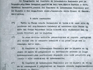 Una trattativa tesa che termina, viene raccontato, quasi improvvisamente con la firma della resa da parte di Meinhold e la consegna delle armi, in cambio viene garantito per la salvezza della vita dei soldati tedeschi: Genova è libera.