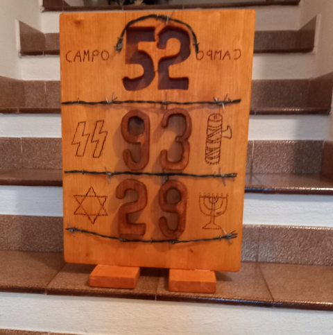 La scultura, che misura cm. 60x40, riporta tre cifre, la prima delle quali, in bassorilievo, si riferisce al Campo, la seconda, in rilievo, agli internati politici e la terza, essa pure in rilievo, agli ebrei. Accanto a queste due i relativi simboli: delle SS, del fascismo e della religione ebraica. Degli inserti di filo spinato completano il richiamo ai detenuti politici, agli ebrei e a uno dei periodi più tristi e tragici del secondo conflitto mondiale.