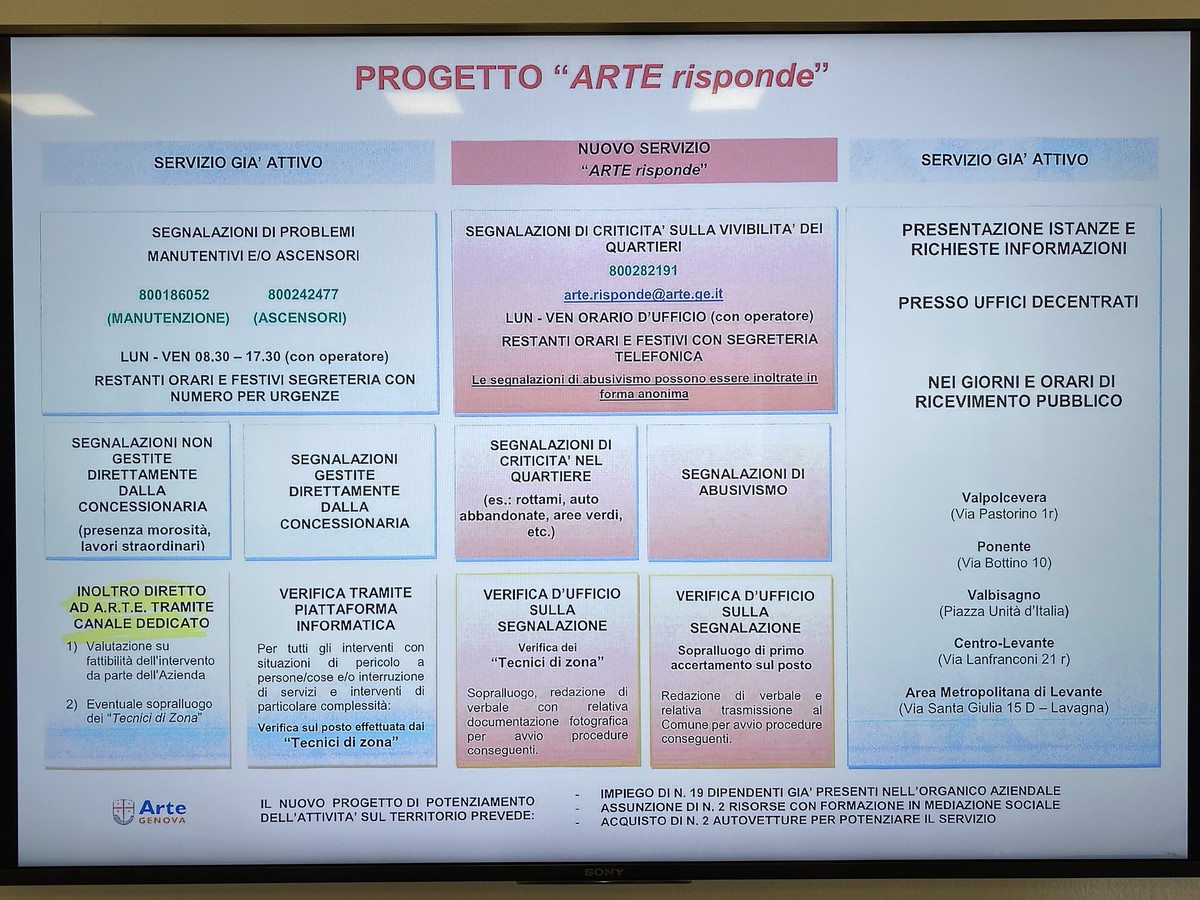 “L’attività svolta da Arte negli ultimi anni è stata molto efficace – continua l’amministratore unico di Arte Genova Paolo Gallo - se si considera ad esempio la grande opera di ricollocazione sul territorio degli abitanti della Diga di Begato e il recupero e la ristrutturazione di nuovi alloggi da destinare agli inquilini. Adesso con il progetto ‘Arte risponde’ intendiamo proseguire quanto già iniziato, con una migliore riorganizzazione delle attività verso l’utenza che porteranno al rafforzamento della presenza di ARTE nei quartieri genovesi, a nuove attività di contrasto all’abusivismo con modalità più dirette, al miglioramento della vivibilità nelle case di edilizia residenziale pubblica, fino allo snellimento delle procedure per una più immediata presa in carico delle problematiche tecniche”.