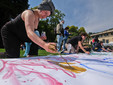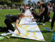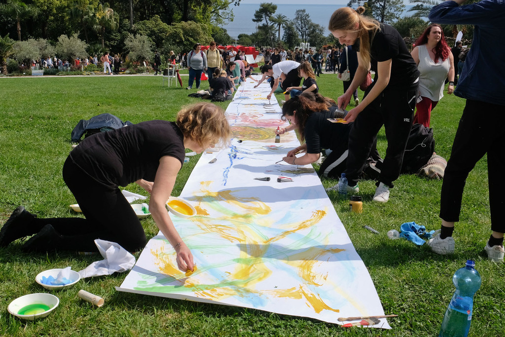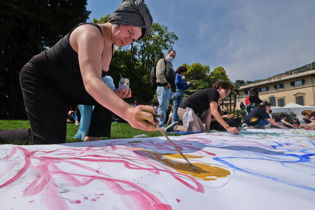 Il largo prato, leggermente in discesa, ha consentito di distendere lunghi rotoli di carta sui quali gli studenti dell’Accademia sono intervenuti “guidati” dalle variazioni musicali degli allievi del Conservatorio.