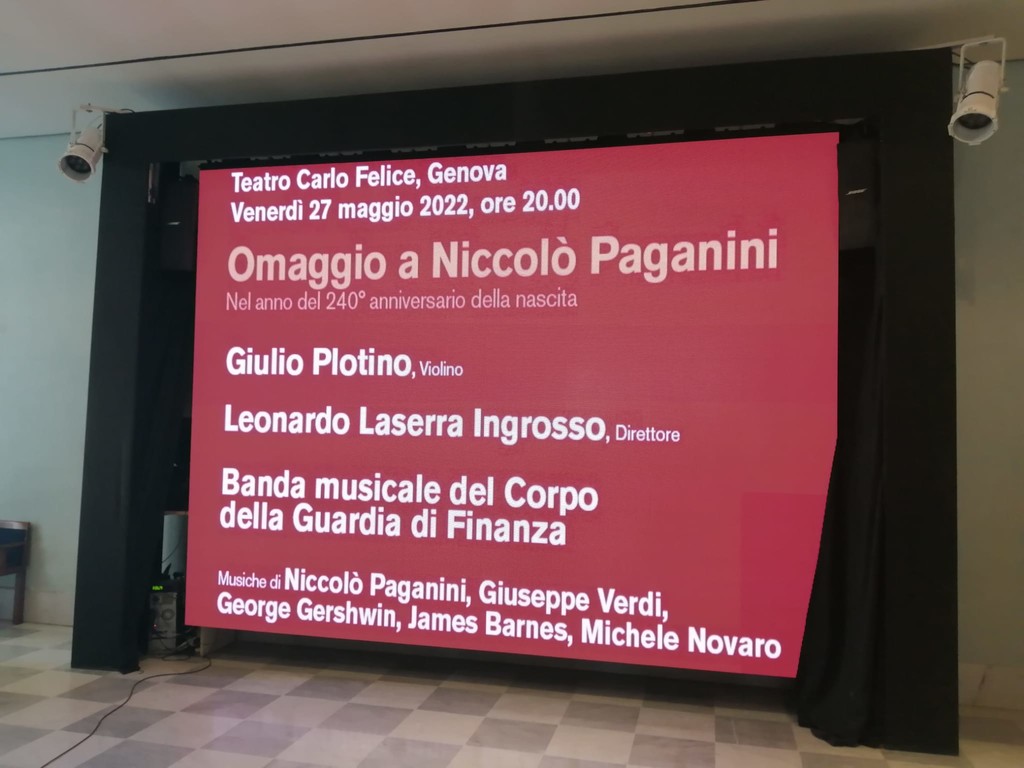 Si tiene al Teatro Carlo Felice di Genova, venerdì 27 maggio 2022 alle ore 20.00 il concerto della Banda musicale della Guardia di Finanza diretta da Leonardo Laserra Ingrosso, solista il violinista genovese Giulio Plotino, tra i laureati della 49° edizione del Premio Paganini 2002, che eseguirà la Maestosa sonata sentimentale, composta da Paganini a Vienna nel 1828.