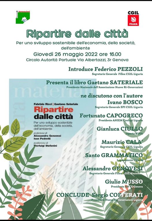 Interverranno all'iniziativa il Presidente dell'Associazione Nuove Ri-Generazioni, Gaetano Sateriale e i rappresentanti locali delle parti sociali e del mondo dell'associazionismo, il Segretario generale della Fillea Cgil Alessandro Genovesi. Concluderà l'iniziativa Sergio Cofferati Presidente Nuove Ri-Generazioni Genova.