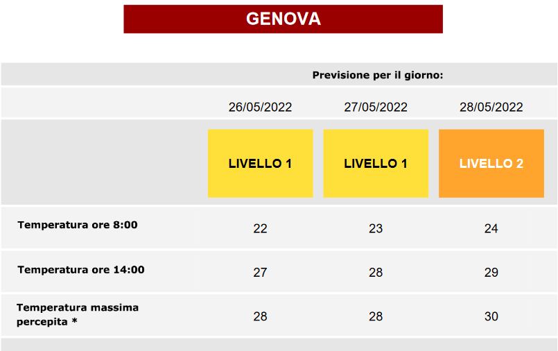 Il sistema nazionale di previsione per le ondate di calore, infatti, ha emesso per Genova il livello 1 di pre allerta, ossia il bollino giallo, che ha interessato la nostra provincia già nella giornata di oggi e che proseguirà anche per domani.