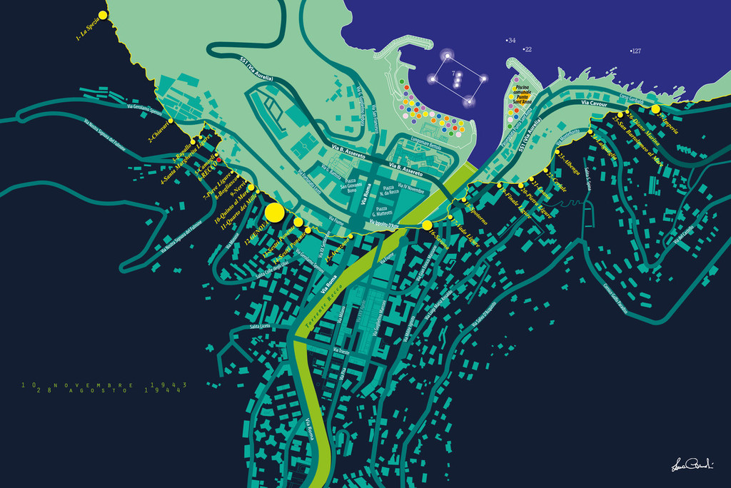 Recco potrà vedersi specchiata in una sola immagine che porta i segni di 80 anni di storia, dal primo bombardamento del 1943 all’ultimo scudetto della Pro Recco nel 2022. Ci sono il mare, gli ombrelloni, il numero 22 come gli aerei della Raf che l’hanno colpita, c’è il 7 come i giocatori di una squadra di pallanuoto che diventano luminosi quanto la costellazione di Orione con i loro 34 campionati italiani vinti e c’è tanto altro. C’è il profilo di parte della Liguria a sostituire l’arco del ponte ferroviario oggetto di tanta furia distruttiva durante la seconda guerra mondiale. Sulla linea della Regione che si sovrappone alla città si individuano 27 località. Vogliono essere un segno di solidarietà storica a Recco, che ha pagato per tutte a causa della sua posizione strategica, con dieci mesi di bombardamenti, 127 vittime, il 90% degli edifici abbattuti. Ma Recco, dopo un colpo così duro, dal 1945 in poi seguendo la sua stella ha saputo rinascere.