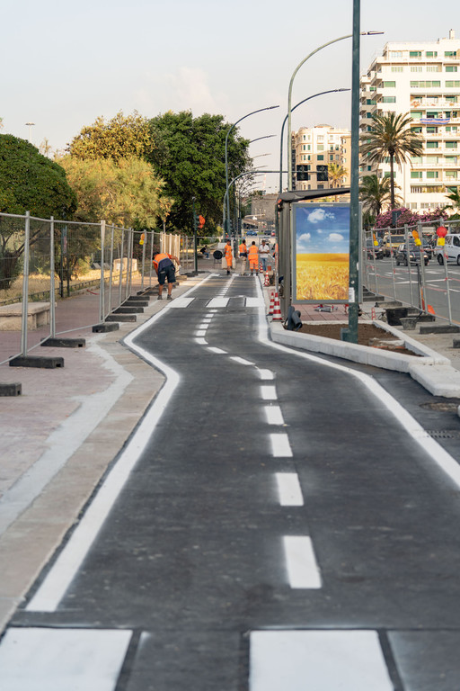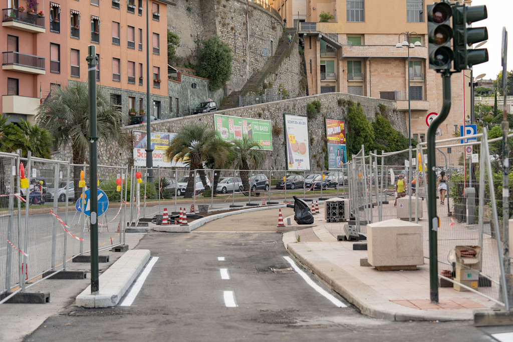 I lavori di esecuzione di questo primo tratto hanno visto la demolizione di tutte le preesistenze e la realizzazione del basamento della ciclabile, e della relativa segnaletica, con il posizionamento dei cordoli che la separano dalla passeggiata di corso Italia, a sud, e dalla carreggiata stradale, lato monte.