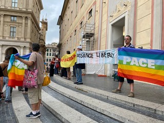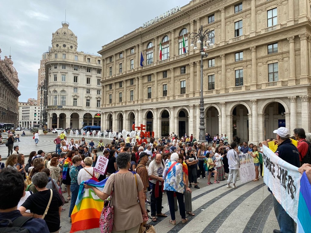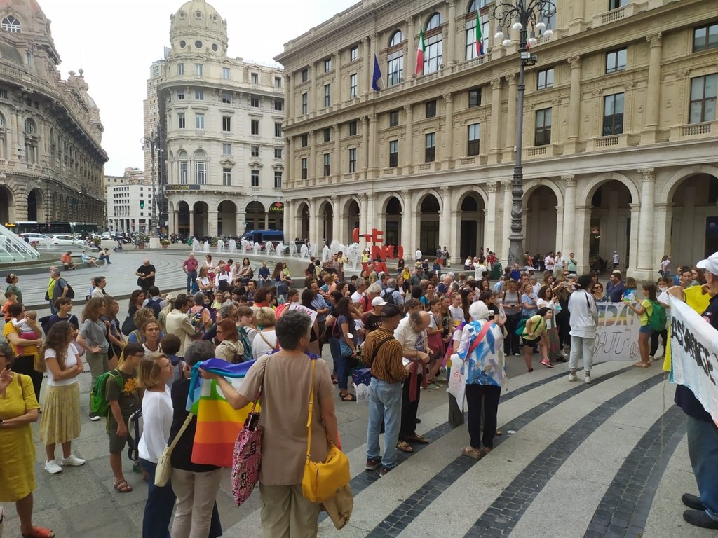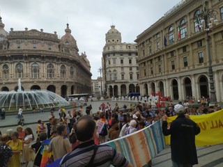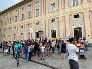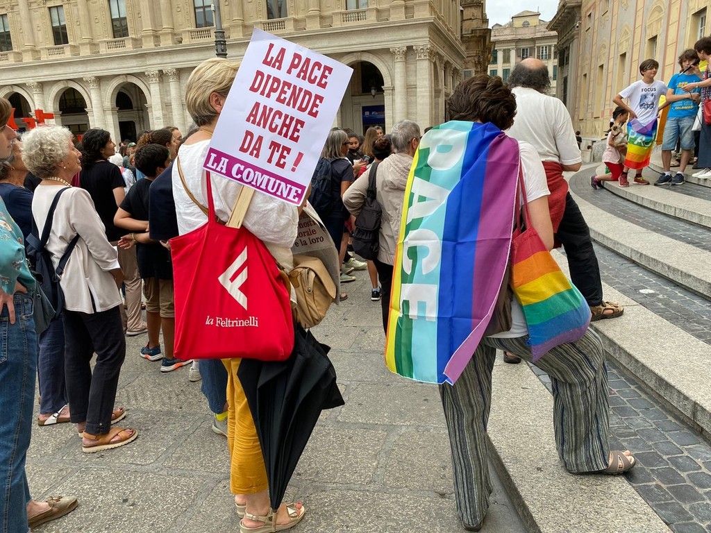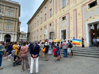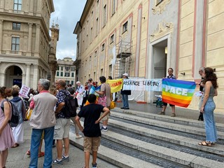 L'ora in silenzio per la pace di Genova, erede di analoghe iniziative in città e nel mondo, è iniziata nel lontano 2001, all'indomani dell'attentato alle torri gemelle: quando è diventato chiaro che il mondo si stava avviando verso l'ennesima guerra. Il luogo era quasi obbligato: quel palazzo Ducale dove 'i grandi della terra' avevano appena svolto la loro parata, promettendo di risolvere qualunque problema e di cancellare il deito estero dei paesi più poveri. Da allora, decine di volte i/le partecipanti hanno sperato che fosse arrivato il momento di "tornare a casa": ma 69 guerre, la mancata accoglienza ed il mancato soccorso ai migranti, l'acquisto degli F35, l'aumento delle spese militari, il razzismo crescente, il traffico di armamenti letali nel porto genovese, li hanno riportati, sui gradini del Ducale per un'ora, mercoledì dopo mercoledì: a distribuire in tutto oltre 350.000 volantini, sostituiti da comunicati on line durante il lockdown. Per un totale, finora, di 1044 ore. Qualche settimana fa, un grandissimo dono: gli/le insegnanti del coordinamento "Chiamata al disarmo per le scuole di Genova" (https://chiamataaldisarmo.blogspot.com/2022/05/una-catena-umana-contro-la-querrapiazza.html) hanno deciso di proporre ai loro allievi ed allieve di concludere l'anno scolastico, proprio mercoledì 8 giugno 2022 alla 1045° ora in silenzio per la pace. Un'iniziativa che assume un valore particolare proprio perché si svolge al di fuori dell'orario scolastico: gli insegnanti danno appuntamento gli allievi per andare "insieme" all'ora in silenzio per la pace numero 1045, non saranno loro a condurli. Davvero un bel segnale di continuità e di speranza".
