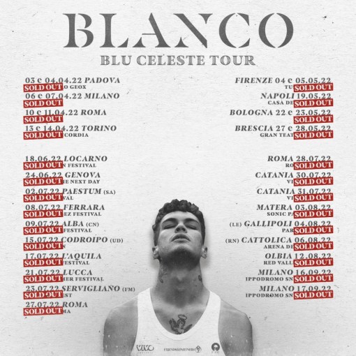Prodotto e distribuito da Vivo Concerti e Friends & Partners, il Blu Celeste Tour ha già totalizzato oltre 300mila venduti, rendendo ormai Blanco un fenomeno inarrestabile. Durante il tour Blanco porterà live tutti i suoi più grandi successi e il suo album d’esordio “Blu Celeste”.