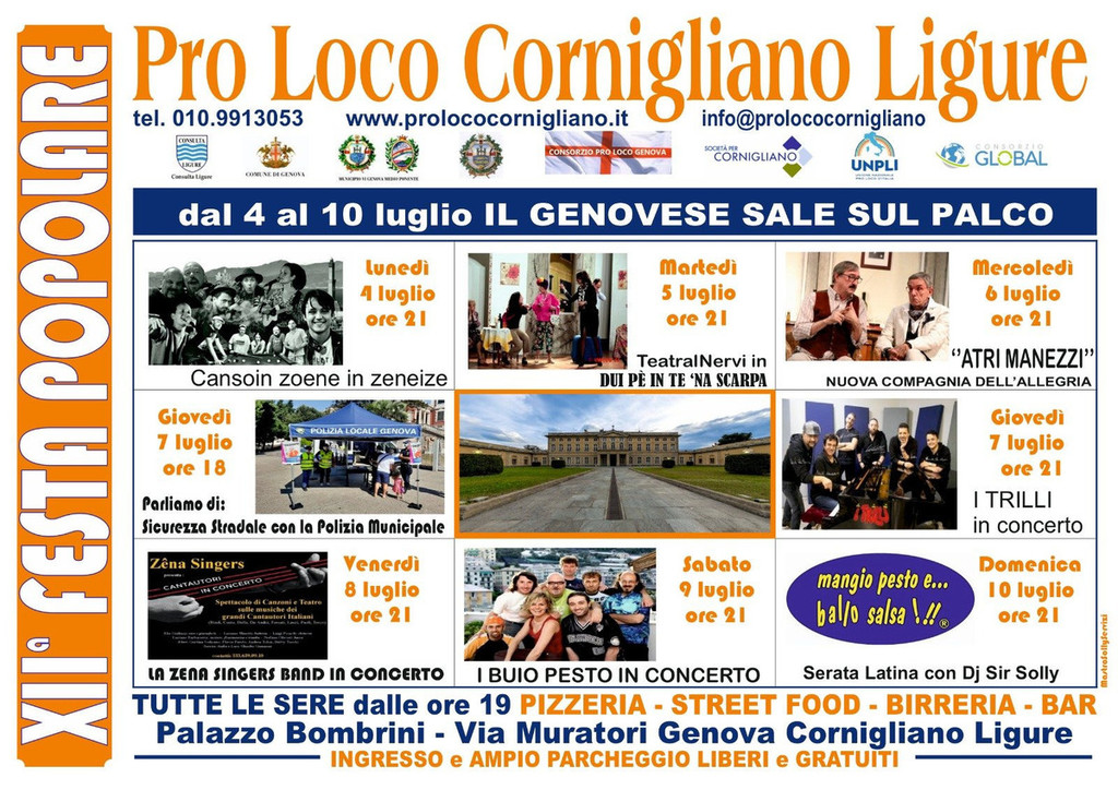 Musica, teatro ma anche educazione civica con la giornata di giovedì 7 luglio dedicata alla sicurezza stradale e dove i docenti saranno agenti della Polizia Municipale. Il meglio possibile e insegnare come comportarsi in strada o alla guida di moto e di veicoli. La sera dello stesso giorno, alle 21, appuntamento imperdibile con I Trilli, che saranno in concerto a Cornigliano. La Zena Singers Band sarà invece sul palcoscenico venerdì 8 luglio alle 21, proponendo musiche dei grandi cantautori italiani. A chiusura di questa intensa e divertente sette giorni di musica e teatro ci saranno, sabato 9, i Buio Pesto in concerto e la spumeggiante musica latina domenica 10 luglio alle 21, con il dj Sir Solly. Tutti spettacoli aperti alla città e a titolo gratuito.