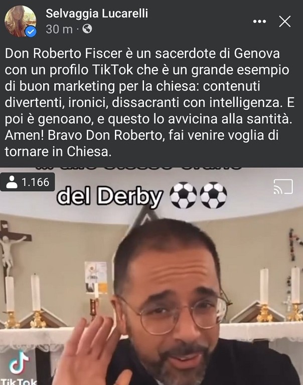 “Don Roberto Fiscer è un sacerdote di Genova con un profilo TikTok che è un grande esempio di buon marketing per la chiesa: contenuti divertenti, ironici, dissacranti con intelligenza. E poi è genoano, e questo lo avvicina alla santità. Amen! Bravo Don Roberto, fai venire voglia di tornare in Chiesa”. L'attestato di stima per il parroco genovese arriva da Selvaggia Lucarelli, giornalista, volto noto della tv e dei social.