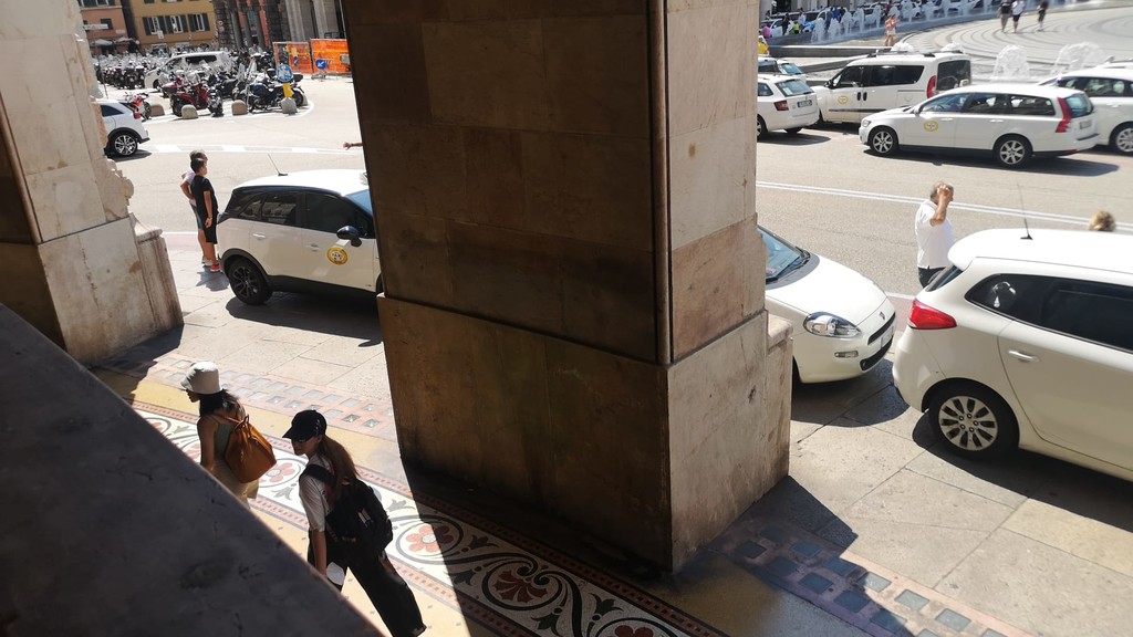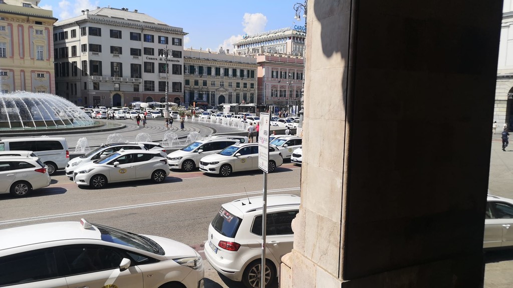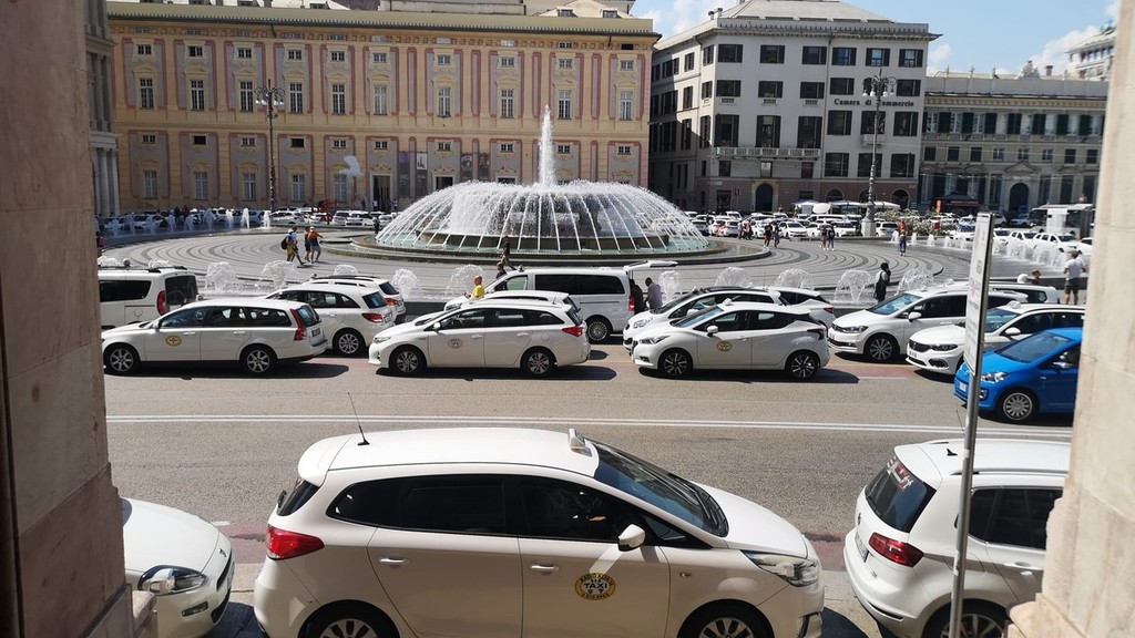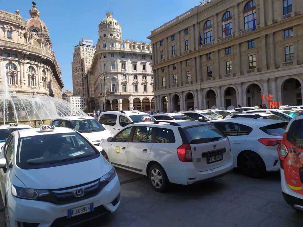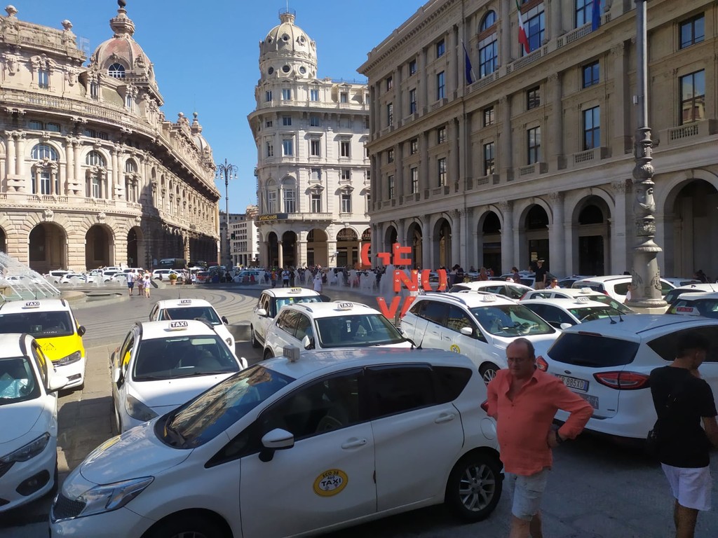 Centinaia di taxi hanno 'invaso' piazza De Ferrari questo pomeriggio. Sono ore calde per la definizione del Dl concorrenza, di cui i tassisti hanno chiesto uno stralcio per evitare l'apertura al servizio alle multinazionali